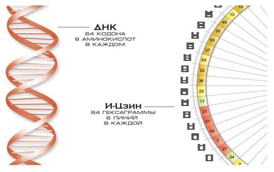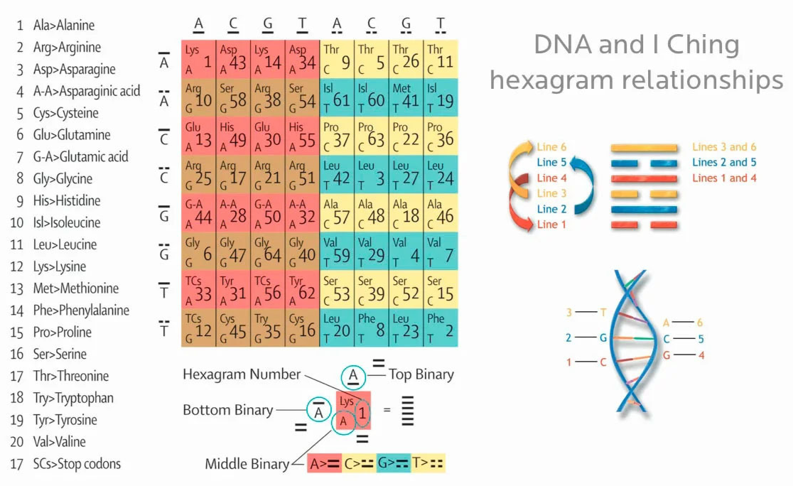 Чтобы увидеть перспективу соединения ДНК и И-Цзин необходимо использовать биграммы. Биграмма состоит из двух линий, число сочетаний которых дают 4 варианта. При записии генетического кода используются 4 "буквы", которые связываются друг с другомпо определенным правилам. Эти буквы: Аденин (А), Цитозин (С), Гуанин (G), Урасил (U). Аминокислоты записываются последовательстями из трех "букв" (например UUU), которое называется кодонами. Следовательно, так же, как из 4-х различных биграмм образуется 64 разные гексаграммы, так и 4 генетические буквы А, C, G и U составляют 64 кодона, т.к. каждая аминокислота кодируется тройной комбинацией (триплетом) нуклеидов, гексаграммы И-Цзин можно соотнести с соответствующими аминокислотами.